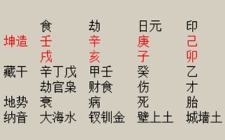 从一个人的生辰八字中看对象的长相和性格,一般是从其八字中的出生日地支结合其妻星或夫星的五行属性和旺衰来看的。例如,如果一个的人的夫星或妻星甲木或出生日地支中藏有甲木,那么,这个人的对象就是长脸,皮肤青白,眼睛较漂亮,眉毛较浓,头发较粗,男的身材较高,女的身材中等偏高。性格多忠厚、重情义、富于想象、理想远大、但有时有点想不开。如果能结合五行的旺衰来看,就更准一些。下面列举一个八字说明(见上图)。