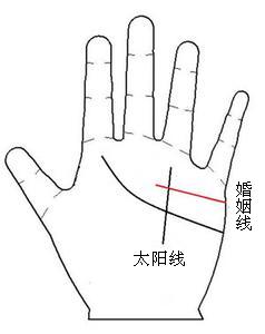 婚姻线是位于小指下方与感情线之间的短线(如上图)。有些女孩的婚姻线特别长,有时会延伸到无名指下方,与太阳线交叉而成为十字形。一般具有这种手相特征的人,表示将可能会嫁给大富翁,或者嫁给有社会地位的人当媳妇,过上幸福的生活。